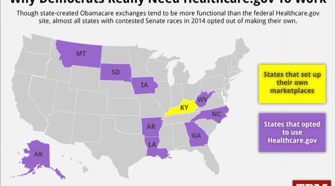 This map and reporting from Daniel Strauss shows why Democrats should be worried about fixing Healthcare.gov in time for 2014 Senate races. Of the top ten most competitive races, only Kentucky built its own health insurance marketplace, and it enrolled more people than the nine other states with competitive races combined. Those states are forced to use Healthcare.gov, so Democrats in those states better hope it starts working — soon.