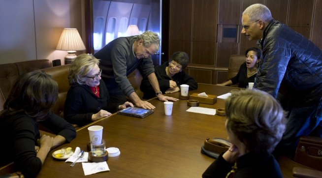 Some great pics from aboard Air Force One en route to Nelson Mandela’s memorial service, including George W. Bush showing Hillary Clinton photos of his post-presidency paintings (above).