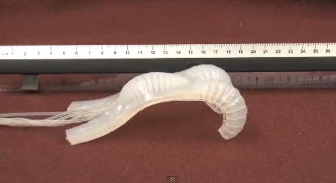 There’s a new star out of Harvard University, and this one isn’t human: Instead, it’s a soft-bodied, squid-inspired pneumatic robot, which can perform a variety of slithering-like movements to get around and underneath obstacles, depending the order in which its four “arms” are inflated, according to a paper published recently in the journal Proceedings of the National Academy of Sciences.