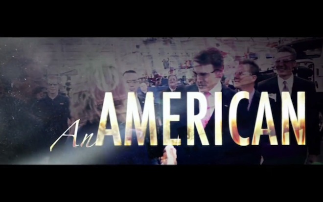 The result? A T-Paw style swelling soundtrack and movie feel, with a Rick Perry style barely-veiled assault on President Obama’s respect for the nation he leads. Also there’s a huge, blaring reminder that Perry is “An American.”