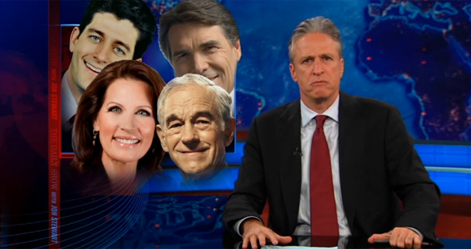 “It’s never enough for the media,” Stewart said. “They’re like children: ‘Mom, can I get a Paul Ryan?’ ‘I just got you a Rick Perry! And you already broke your Michele Bachmann. And before I get you anything else, where the fuck is your Ron Paul?'”