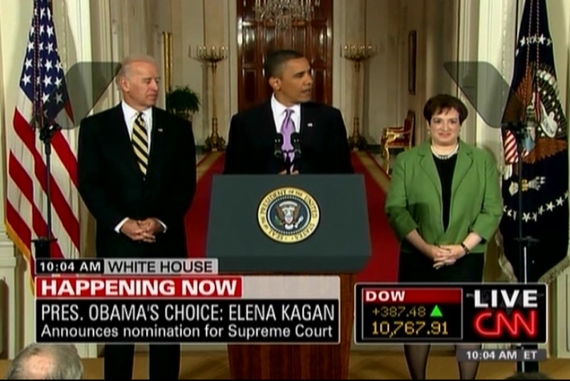 Introducing her as “our solicitor general and my friend, Elena Kagan,” Obama, flanked by Vice President Joe Biden and Kagan, said that “Elena is widely regarded as one of the nation’s foremost legal minds.”