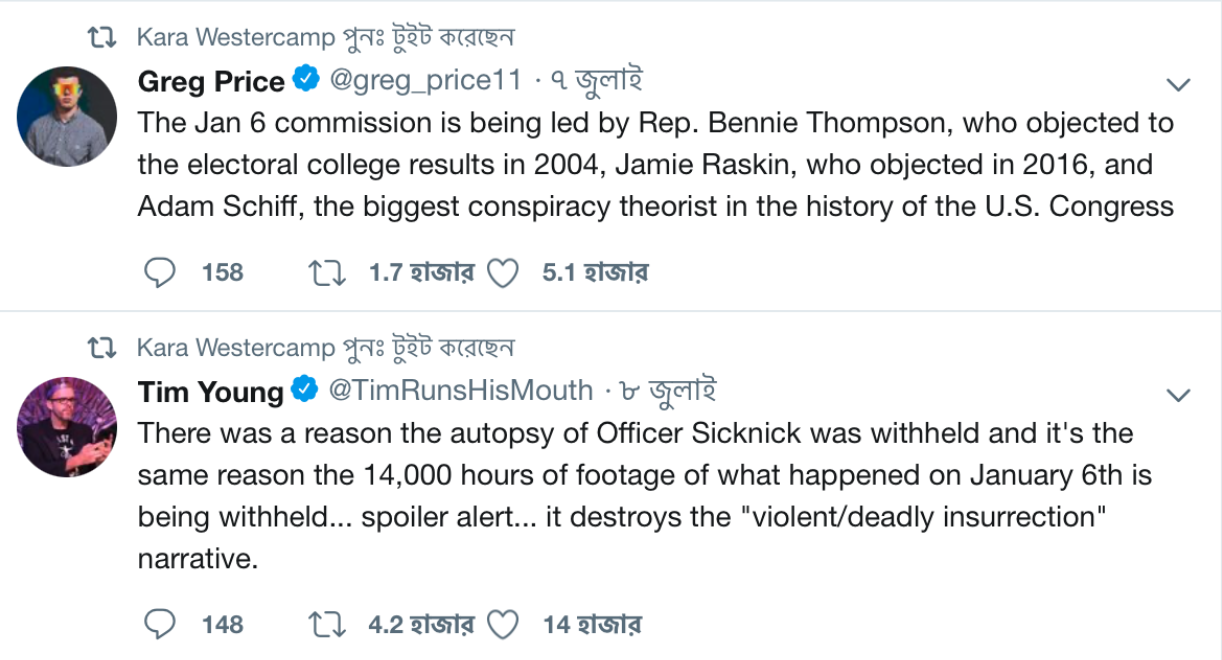 Also scattered across Westercamp’s Twitter timeline between October 2016 and February 2023 are tweets and retweets that (among many other things) question the results of the 2020 election, parrot transphobic talking points, sympathize with January 6 insurrectionists, and generally express unbridled enthusiasm for Trump and his political movement.