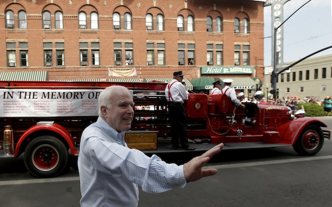 The firefighters were killed a week ago in the Yarnell Hill fire, sparked by lightning on June 28. It was 90 percent contained Saturday, after destroying more than 100 homes in Yarnell and burning about 13 square miles. The town remained evacuated.