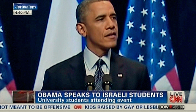 In a speech Thursday in Jerusalem to scores of university students, Obama says peace in the Middle East is necessary because it is the only true path to security. He says the only way for Israel to endure and thrive in the region as a Jewish and democratic state is through the realization of an independent and viable Palestine.