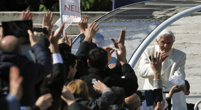 Under a bright sun and blue skies, the square was overflowing with pilgrims and curiosity-seekers. Those who couldn’t get in picked spots along the main boulevard leading to the square to watch the event on giant TV screens. Some 50,000 tickets were requested for Benedict’s final master class, but Italian media estimated the number of people actually attending could be double that.
