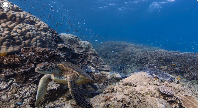 And here’s one of the panoramas Google and Catlin captured in their survey of the Great Barrier Reef. It shows Green sea turtles swimming off Heron Island, Australia.