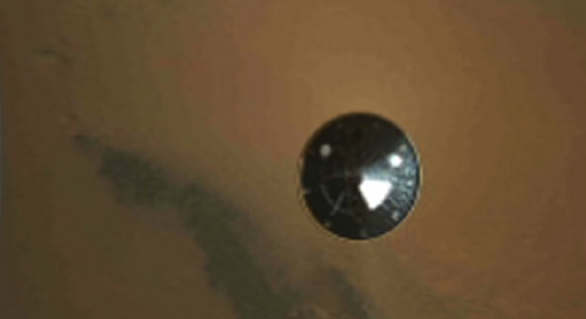 The new full-color images — taken by an onboard, downward-looking camera, clearly show the rover rapidly approaching the surface of Mars during its final two and-a-half minutes before landing. The first image in the series of 297 images shows the rover landing craft’s heat shield being ejected from below.