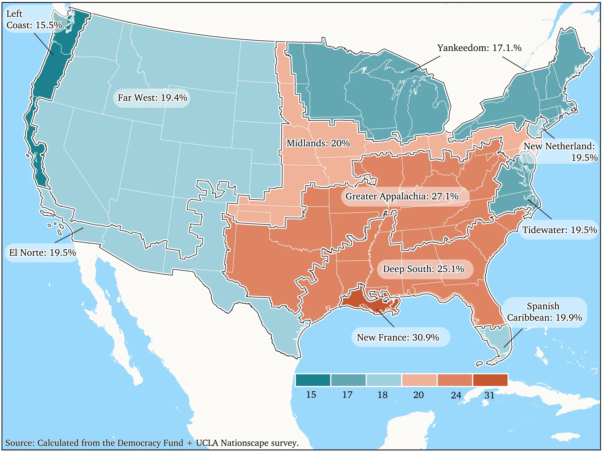 Supermajorities in every American Nations region reject an outright ban on abortion, and large majorities everywhere believe the procedure should be legal for reasons beyond incest, rape, and the life of the mother. But support for a total ban is nearly twice as high in New France — that’s southern Louisiana — (at 30.9 percent) than in the Left Coast (15.5 percent). The block wanting a ban is about a quarter greater in the Deep South and Greater Appalachia (where it’s a bit more than a quarter of the population) than in Yankeedom, Tidewater, El Norte, New Netherland, or Spanish Caribbean (all between 17 percent and 20 percent). We found a very similar pattern when probing opposition to abortions for reasons other than rape, incest, or saving the life of the mother.