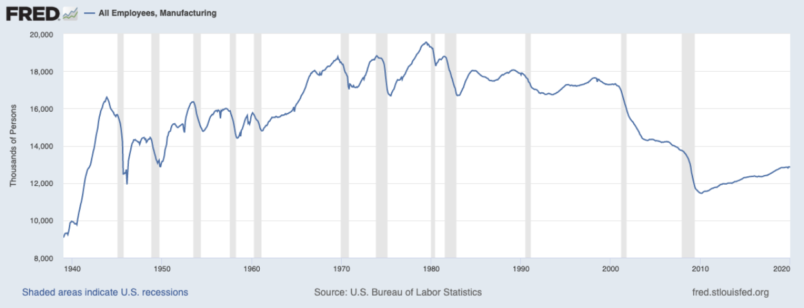According to the Federal Bureau of Labor Statistics, manufacturing employment peaked in June 1979 with about 19.5 million workers. Employment had already fallen precipitously by the time the U.S. entered the 2007 recession, when the number of Americans employed in manufacturing stood at 13.7 million. The industry bottomed out around February 2010 at 11.4 million. By the time Obama left office in December 2016, manufacturing had rebounded to 12.35 million. At the end of January, this figure was 12.85 million — following two straight months of declines.