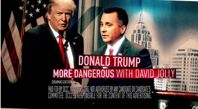 The anti-Jolly ad, for instance, features images of his face photoshopped next to Trump in a hypothetical world where Trump is president. The ad labels it as a “dramatization.” Jolly has been one of Trump’s toughest GOP critics, having called for him to drop out of the race after he proposed banning Muslim immigration and having continued to refuse to endorse Trump. A letter from the Jolly campaign’s attorney to local Florida stations called the ad “patently false” and threatens “legal remedies” if the ad’s run was continued.