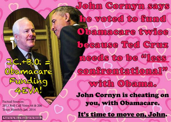 Earlier, in January, Stockman drew up a faux Valentines day card featuring a heart-shaped photo of Cornyn and Obama, which read, “John Cornyn is cheating on you, with Obamacare.”