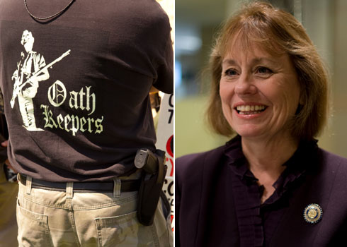 The peculiar ideology of Sharron Angle, the Republican nominee challenging Sen. Harry Reid in Nevada, is perhaps no better illustrated than by her embrace of the patriot group Oath Keepers, whose membership of uniformed soldiers and police take an oath to refuse orders they see as unconstitutional — including enforcement of gun laws, violations of states’ sovereignty, and “any order to blockade American cities, thus turning them into giant concentration camps.”