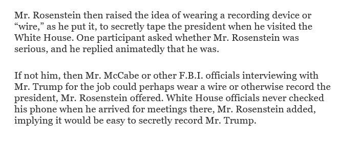 In the end, the idea went nowhere, the officials said. But they called Mr. Rosenstein’s comments an example of how erratically he was behaving while he was taking part in the interviews for a replacement F.B.I. director, considering the appointment of a special counsel and otherwise running the day-to-day operations of the more than 100,000 people at the Justice Department.