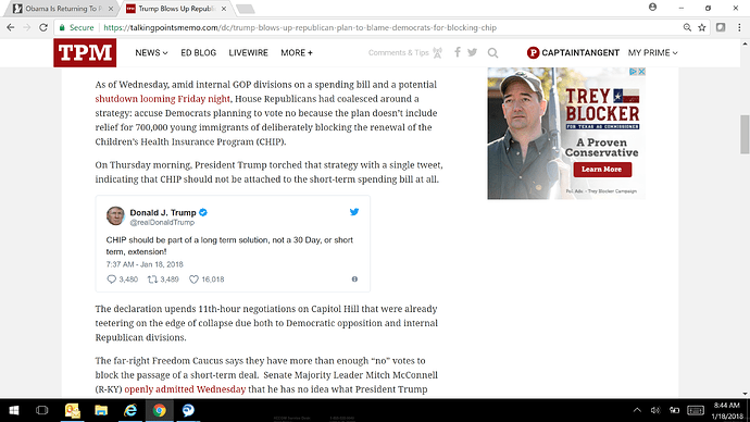 On Thursday morning, President Trump torched that strategy with a single tweet, indicating that CHIP should not be attached to the short-term spending bill at all.