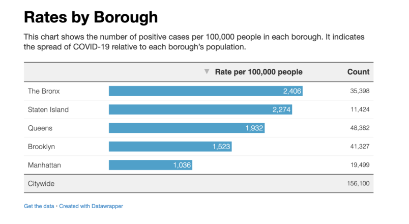 Yesterday Gov. Cuomo reported that 24.7% of New York City residents had COVID19 antibodies after a second week of testing. But as the lowest income borough the Bronx must have a very high concentration of essential workers. There’s the least ability to get out of the city. There’s all issues tied to heavier concentrations of people, multigenerational homes. And the hard numbers back this up: According to the latest city data, on a per capita basis the Bronx has almost 2.4 times the number of positive tests for current illness (so the active infection rather than the serology tests). You can see that Staten Island is second highest. But Staten Island is by far the smallest borough by population.