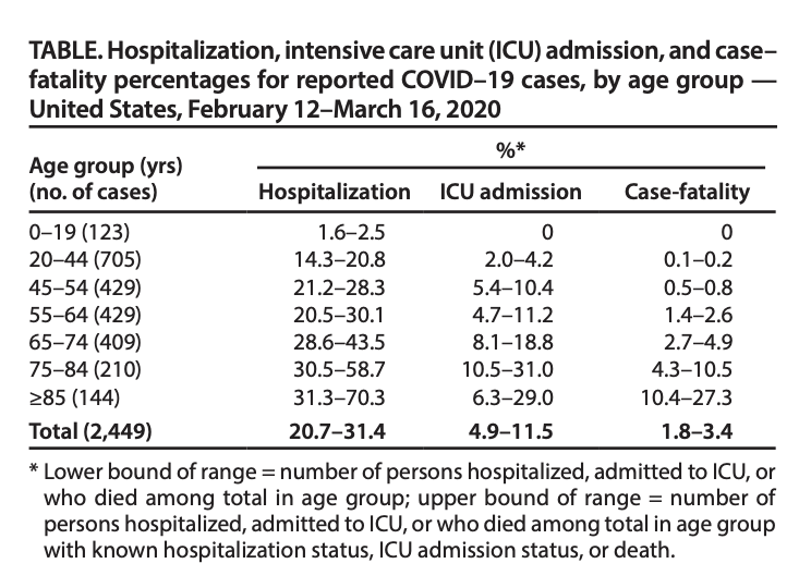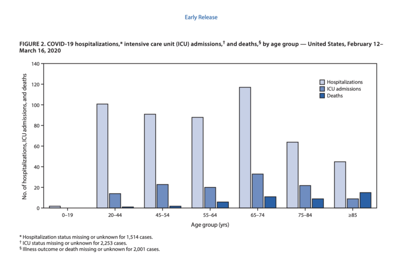 The CDC just released this report on COVID-19 disease incidence and outcomes in the United States between February 12th and March 16th. The authors make clear that in the rush of recent events there is a lot of data that has yet to be compiled on the 4,226 cases studied. Let me quote their caveats: “This report describes the current epidemiology of