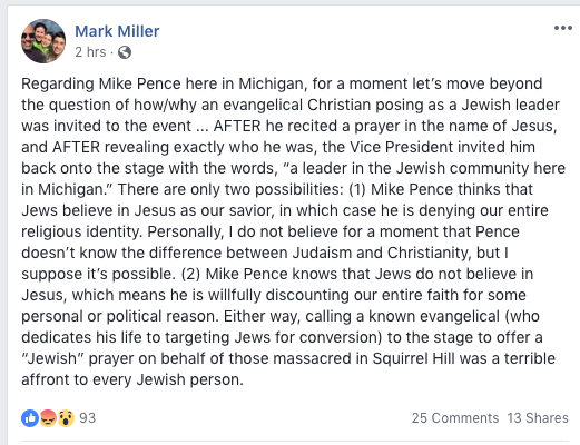 Yesterday I discussed this bizarre incident where a “Jews for Jesus” faux rabbi did some kind of invocation or prayer at an event Vice President Mike Pence held for Rep. Mike Bishop and candidate Lena Epstein. Making it particularly offensive is that the ‘rabbi’, Loren Jacobs, was asked to say a prayer on behalf of the eleven Jews murdered at the synagogue in Pittsburgh. I tried to explain some of it in this post last night. Suffice it to say that most Jews have a viscerally negative reaction to this group, which they correctly see as a stalking horse for evangelical groups trying to convert Jews to Christianity. Which brings us to the question: who the hell invited this guy?