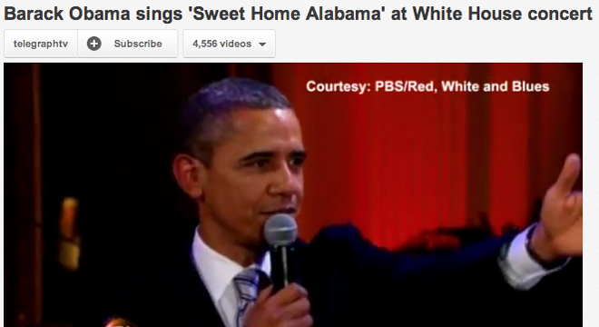 As you can see, The Daily Telegraph‘s YouTube page bills Obama as singing the Southern rock anthem “Sweet Home Alabama” — instead of “Sweet Home Chicago.”