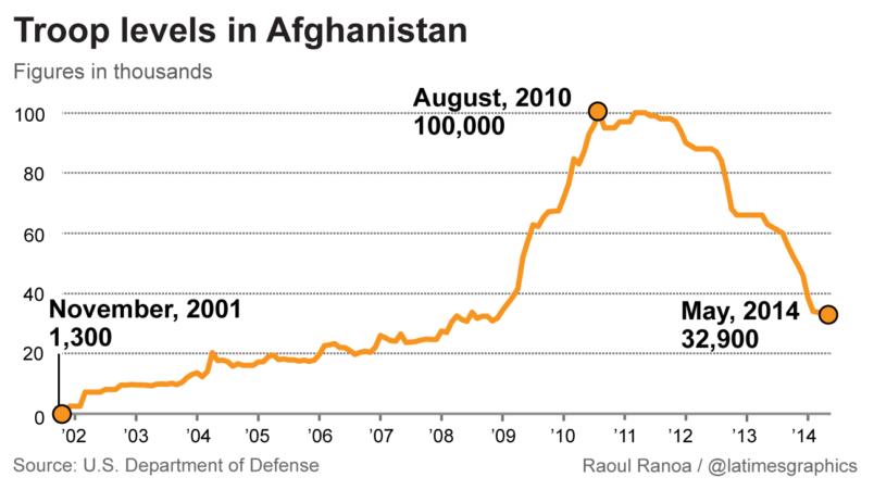 In looking at the history of President Biden’s aversion to the US garrisoning of Afghanistan, I’ve repeatedly mentioned his experience watching then-President Obama get rolled by the Pentagon into supporting the Afghanistan “surge” during his first term. Biden opposed it; Obama was convinced. It’s worth remembering how massive a decision this was. Through 2002 and 2003 there were scarcely more than 10,000 US and NATO troops in Afghanistan. Over the course of Bush’s presidency that number crept up toward around 30,000. In 2010/2011 ‘surge’ era that number reached as high as almost 100,000. This LA Times infographic captures the story through through 2014 …