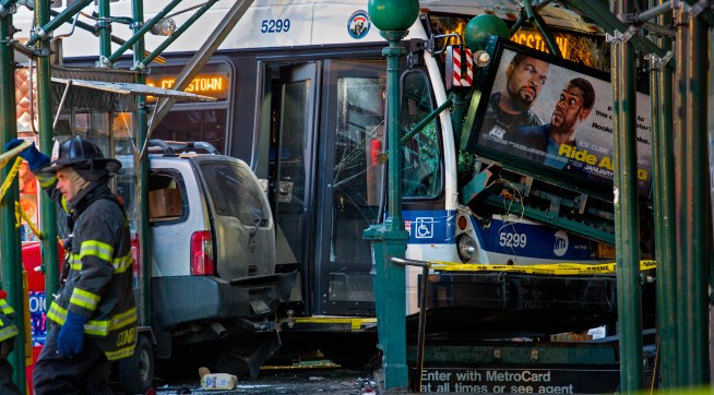 About 5:30 this morning NYPD patrol cars were engaged in a high speed chase of a stolen truck in Greenwich Village when the truck collided with an MTA commuter bus. Both vehicles then careened up onto a sidewalk and plowed into building scaffolding where both vehicles came to a stop. William Pena, who had been driving city buses since 1996, was pronounced dead on the scene. Three passengers were taken to a local hospital. The driver of the truck suffered minor neck injuries and was taken into custody.