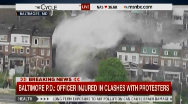 (Ed.Note: There appears to have been more than one fire in Baltimore this afternoon and evening. The largest is at a senior center that was under construction. But there are conflicting reports about whether the fire was connected to the rioting and protests.]