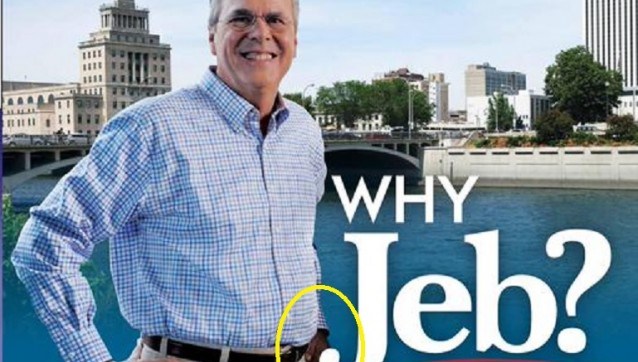 Is it getting this bad? Flailing in the polls and struggling to find a rationale for his candidacy, is Jeb Bush suggesting he may be black? Judd Legum at ThinkProgress points out that the Jeb SuperPac ‘Right to Rise’ has just blanketed Iowa with a mailer in which Jeb’s head appears to be photoshopped on to a black man’s body.