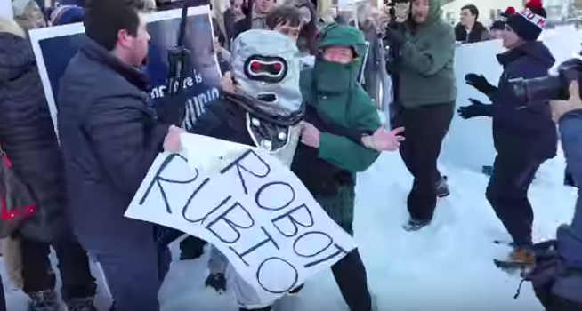 It now seems clear that Marco Rubio, just days ago the consensus pick for Republican nominee, came in 5th place tonight in New Hampshire. If you average it with 3rd place in Iowa, it’s 4th place combined. But that’s really just putting a pretty face on it. Rubio did promise supporters tonight that he’d never screw up like that again. But it now seems clear that the foreshadowing of this debacle, the frustration, the broken dreams, the failed Turing Test could be seen this afternoon when Rubio’s New Hampshire campaign chairman, Cliff Hurst, assaulted a protestor dressed as a robot at a Rubio event.