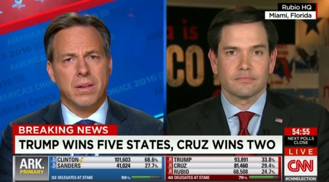 Tapper just now to Rubio: “Senator, you keep saying that and he keeps winning states and you’re talking about Virginia and that’s another state that Donald Trump won. I’m wondering if there’s a certain amount of denial that you’re in about this race.”