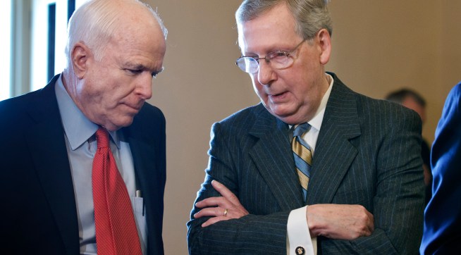 We’ve been slogging through the evening toward what was seeming like an inevitable passage of a godforsaken Obamacare repeal bill that not even most Senate Republicans liked or wanted to see become law. But in the last several minutes things have ground to a halt on the Senate floor, and it is increasingly looking plausibly like Mitch McConnell lacks the votes to pass the so-called skinny repeal bill. TPM’s Tierney Sneed is in the Senate chamber and from her vantage point things look amiss. It’s easy to read way too much into minor things, but at the moment Senate business has stalled. McConnell and Vice President Mike Pence and other key Republicans are all on the Senate floor, and the presumed no votes are being worked hard, Tierney reports. Among the possible no votes is John McCain. Pence has been talking to McCain for 20 minutes, Tierney reports. Stay tuned …