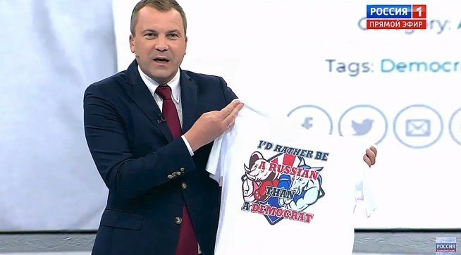 This is probably nothing. But it got my attention. A few days ago two Trump supporters at the President’s rally in Ohio showed up in T-Shirts that read “I’d Rather Be a Russian Than a Democrat”. A reporter at the event asked them where they got it and one of the men said he’d printed them up himself. Then about a day later what appears to the be the same kind of shirt showed up in the hands of a Russian TV presenter.