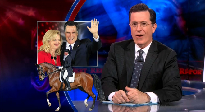 In support of Romney’s horse, Colbert is making dressage — or “horse ballet” — the official summer sport of the Colbert Report.