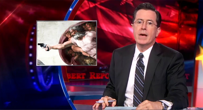 “Guns are the work of an omniscient creator,” Colbert said. “Why else would they perfectly fit into a human hand?”
