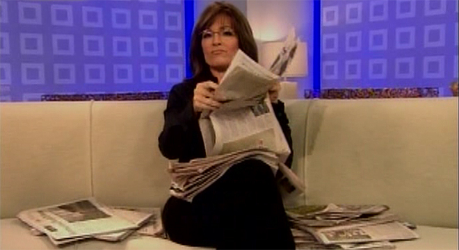Early risers on Tuesday were greeted to the sight of Palin jokingly flipping through newspapers on the Today show couch, a play on her famous answer to Couric where she was unable to answer which papers she read.