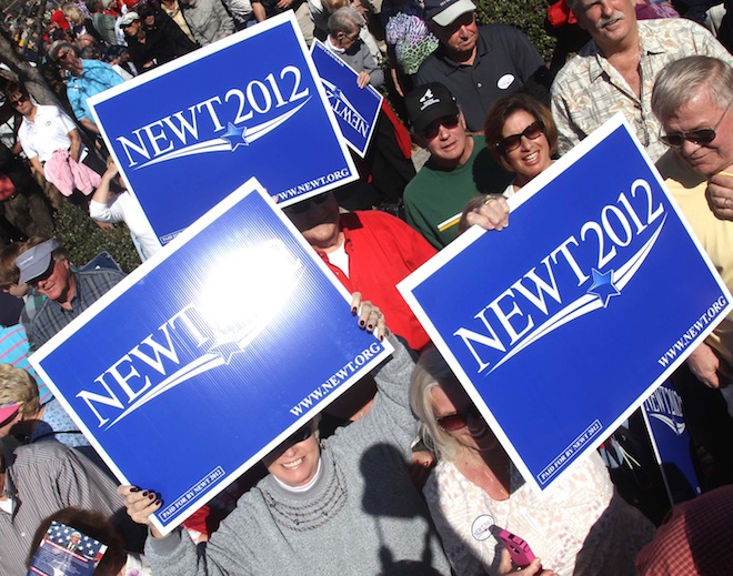 A big advantage Gingrich has over Romney is that he’s much more willing to name-check many of the anti-Obama arguments favored by the Tea Party that are too politically incorrect for the frontrunner to touch. Gingrich frequently warns of creeping Sharia law, calls Obama a “food stamp president,” and credits the president’s decision-making to his “Kenyan anti-colonial” ideology. Even for a Republican candidate, Gingrich’s voters skew elderly, the wing of the party most susceptible this kind of language.