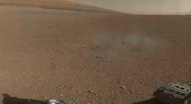 These eight shots — stitched together to create a single uninterrupted view of Curiosity standing on the surface of the Red Planet — were taken by the rover’s twin navigation cameras, or Navcam, which are capable of capturing 3D images. Watkins pointed out that when zoomed in on the center of the rover, there are clearly visible pebbles resting on its body — the dark gray spots. Watkins said that these were “apparently kicked up by landing event,” and while they “pose no problems for operations” and there is no “operational constraint” by them being there, NASA scientists didn’t expect the landing to displace the rocks this way.