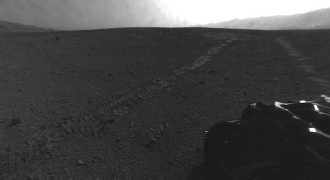 Another black and white “fisheye” shot after the first test drive on August 22, clearly reveals the distinction between the single line of Morse code pattern and the zig-zag pattern that makes up the remainder of each rover wheel’s tread.