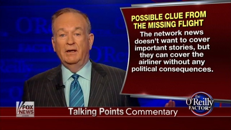 It’s the second time O’Reilly has railed against coverage of the missing plane this week. He and Charles Krauthammer lamented Tuesday how Flight MH370’s “painful” media coverage was “corrupting” the news business.