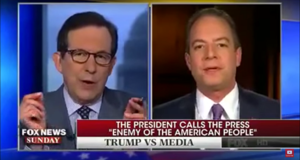 Fox News host Chris Wallace on Sunday pressed White House chief of staff Reince Priebus to explain President Donald Trump’s comment that the press is “the enemy of the American People.”