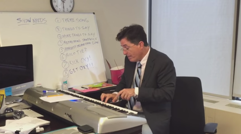 The former host of “The Colbert Report” released a video from his new official CBS YouTube channel on Monday, revealing him at a keyboard working out the kinks in his new gig’s opening theme.