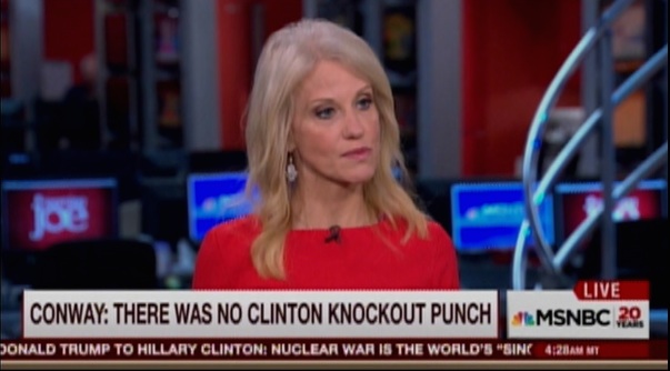 During an interview on MSNBC’s “Morning Joe,” Conway said that Hillary Clinton sometimes looked “glib” while Trump was speaking during the debate before pivoting to Trump’s decision not to bring up Bill Clinton.