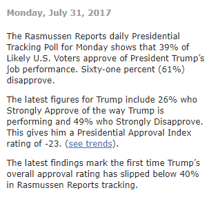 This low in the Rasmussen Poll may mean he is lower in Gallup and Quinnipiac. How low will these numbers need to be before the Republicans desert him?
