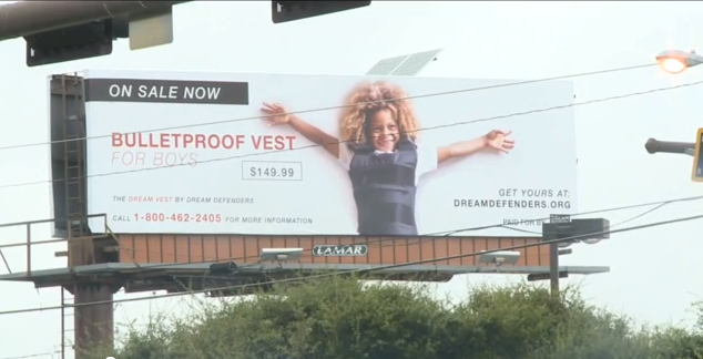 Mocking an advertisement for a clothing line, a billboard by Dream Defenders in Tallahassee, Fla. depicted a sale event with a young black boy modeling body armor, WCTV reported.