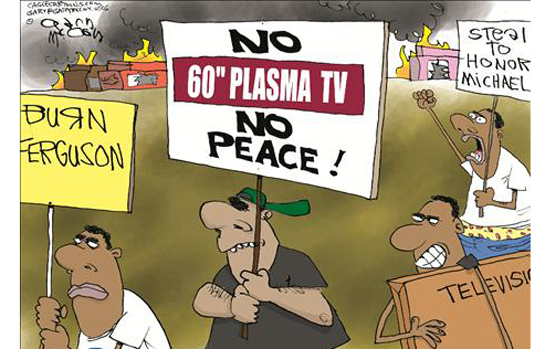 The cartoon by Gary McCoy depicted blacks in Ferguson marching with protest signs displaying messages such as “Burn Ferguson,” “Steal to Honor Michael,” and “No 60-inch Plasma TV, No Peace!”