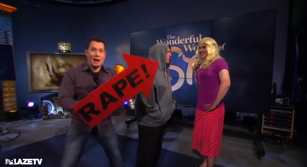 And so network radio host Jeff Fisher and a man in a wig act out their interpretations of the questions asked in the survey, labeling each situation as “RAPE!” They use the skits to mock situations in which men coerce or convince women to have sex.