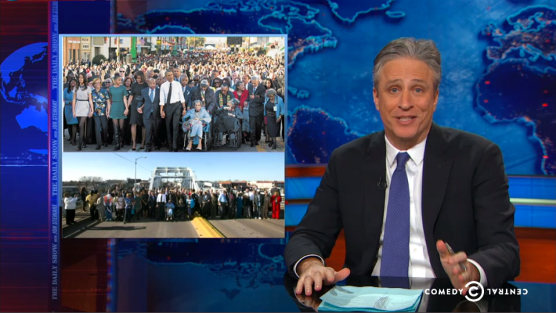 Jon Stewart gave Fox News a slow clap Monday after the network accused the New York Times of cropping former President George W. Bush out of a photo of Saturday’s march in Selma, Alabama.