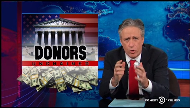 Comedian Jon Stewart was not impressed by Wednesday’s Supreme Court decision to throw out the limits on the total amount of money of a person can donate to campaigns in an election cycle.