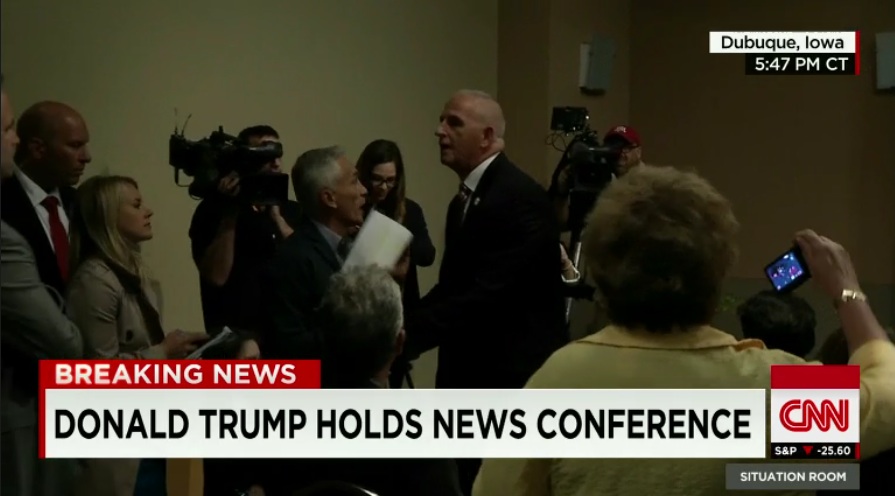“I didn’t escort him out. You’ll have to talk to security, whoever security escorted him,” Trump said. “He just stands up and starts screaming, so maybe he’s at fault also.”