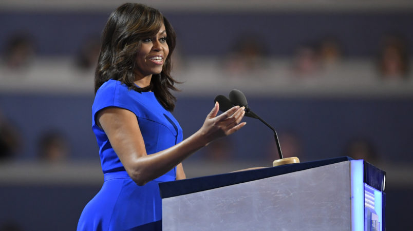 She said that children watch “every word we utter, every action we take” as First Lady and President. In a rather direct reference to Trump leading the birther movement, Obama said she has taught her children, Malia and Sasha, to ignore the people who question their father’s faith and citizenship.