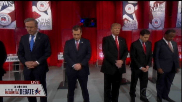 The moment of silence, traditionally a religious gesture, was observed right before a commercial break. All of the candidates on stage bowed their heads in silence, with the exception of real estate mogul Donald Trump, who kept looking straight ahead.